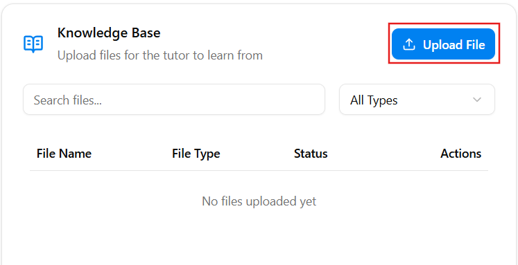 When you upload a file, in the Knowledge Base in Tutor Panel, the chatbot will read it and use the information to help answer questions from you or your students based on the knowledge from the file (as per the directions given). To do that, click Upload File.